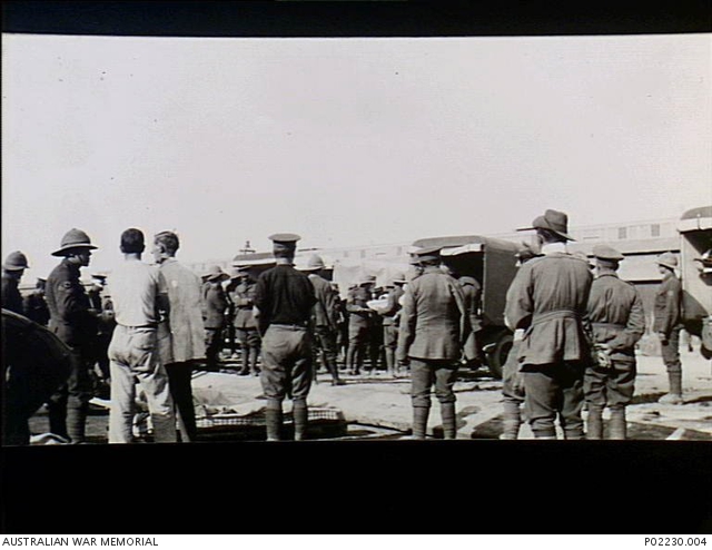 banner pic – Alexandria, Egypt. c. 1915-05. Sick and wounded Australian and British troops watching seriously ill stretcher cases being loaded into ambulances lined up on a wharf. Note the Royal Army Medical Corps (RAMC) personnel grouped at left. The casualties had recently been evacuated from Gallipoli.