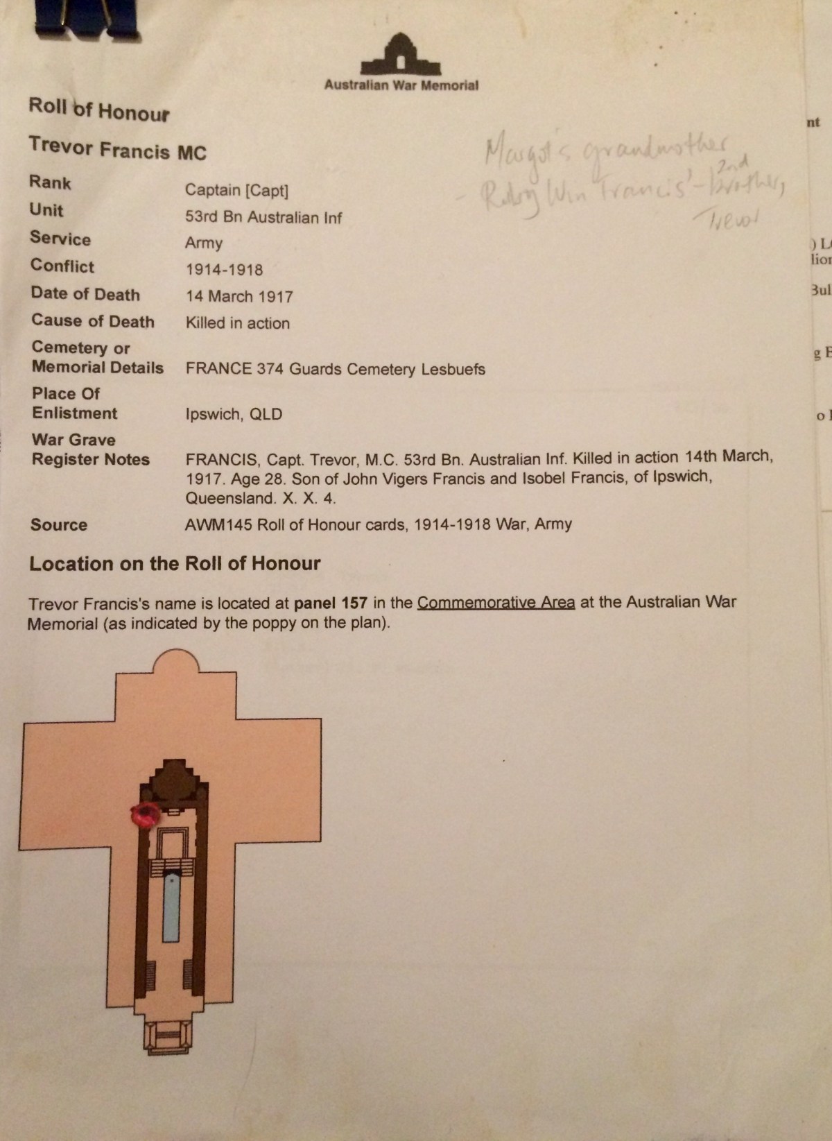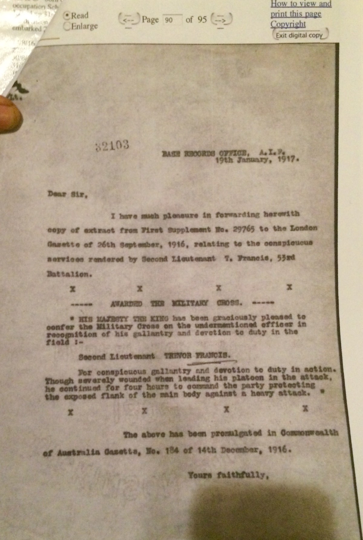 Thank you so much for your very interesting letter (dated Melb 3rd July) which I have just received – from the look of the envelope it seems to have had some difficulty in digging me up. I may also mention that I received another very interesting epistle from you just about two days before we landed at Gallipoli owing to certain circumstances I was unable to answer it at the time – I am indeed sorry to hear that my left-handed letter from Alexandria did not come up to expectation but considering the fact that I wrote it lying down and I had an enormous contrivance called a McEntire splint on my left leg and my right arm was fractured just below the shoulder – not to mention two bullets, which had not been removed at that time – I think I did fairly well – even though it did take me three days to write it. Just before I got your letter I had one from Ginger describing in glowing terms the magnificent success of his carburettor – his description is as follows: